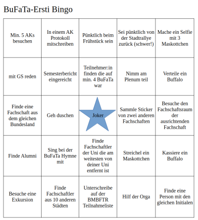 - Low Effort Spiele über die gesamte BuFaTa (Bingo, Mörder, Stromschlag rumgeben (hot potato), Fachschaftübergreifende stille Post, etc)